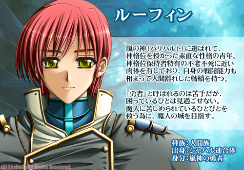 嵐の神(バリハルト)の神格位を持つ傭兵の青年、ルーフィン・ウェイルとその仲間たち一行。皆生い立ちも出身も異なるが、勇者ルーフィンのひととなりに感銘を受け旅路を共にし、悪辣な魔人へと挑むに至る。構成人数は四人と少ないが、各人が一軍団に匹敵する強大な力を有する。